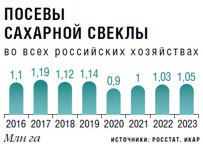 По оценке ИКАР, всего сахарной свеклой в этом году занято 1,05 млн га против 1,03 млн га в 2022-м. С учетом их состояния на июль производство сахара в сезоне 2023/24 пока ожидается больше, чем годом ранее, — не менее 6,2-6,5 млн т (в 2022/23-м — 5,9 млн т), прогнозирует Иванов.