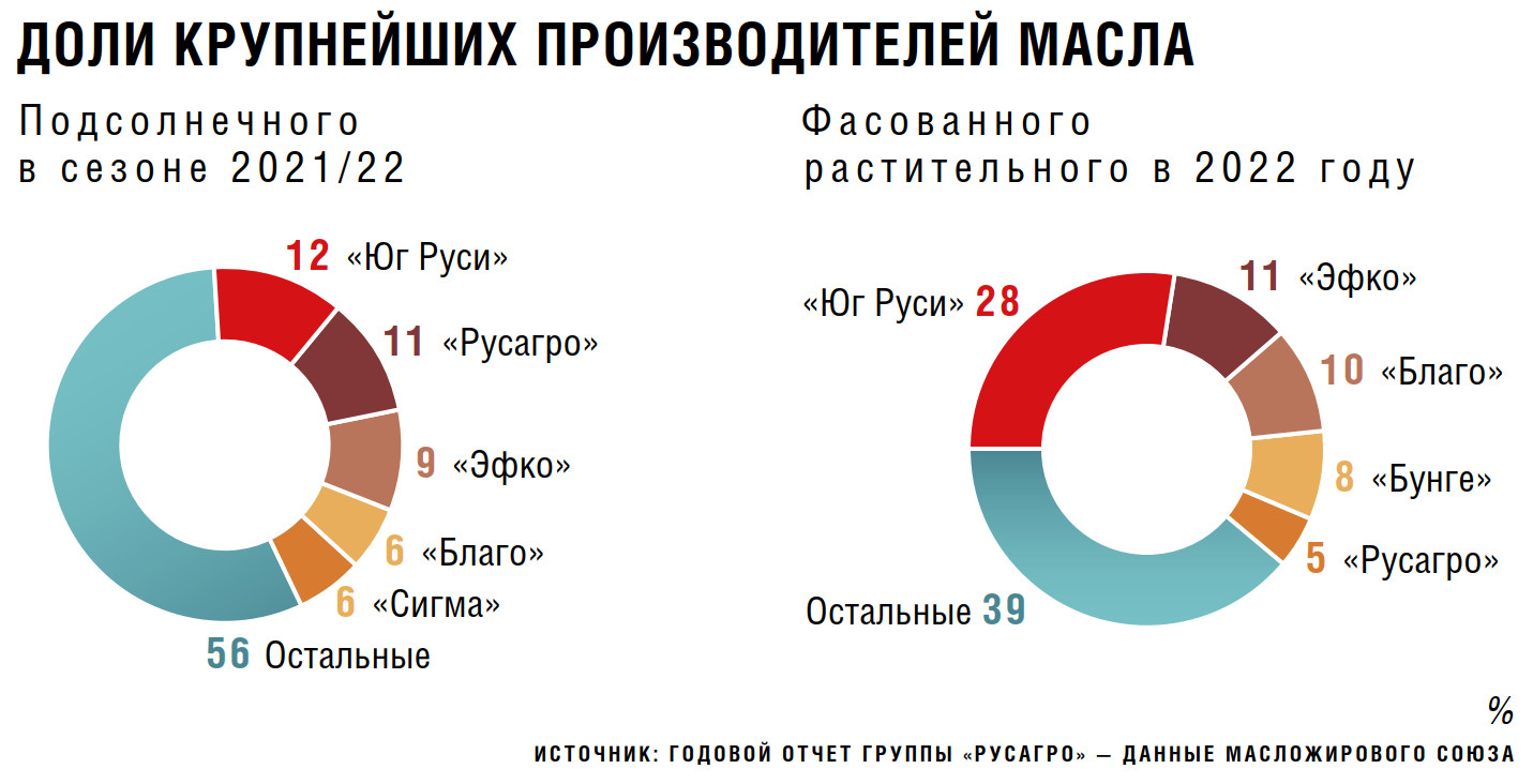 «Агрокомплекс» им. Н. И. Ткачева в 2022 календарном году произвел на «Бейсугском маслозаводе», маслоцехе СОЯ и в цехах по переработке подсолнечника 27 тыс. т подсолнечного масла, говорится в годовом отчете компании. По мнению гендиректора аналитической компании «ПроЗерно» Владимира Петриченко, «Агрокомплекс» привлекает переработка масличных, которая весь прошедший сезон была довольно эффективной и рентабельной деятельностью, учитывая соотношение цен на сырье и готовую продукцию. Экспортная деятельность также могла привлечь агрохолдинг, но уже во вторую очередь: «Юг Руси» поставляет на внешние рынки преимущественно масло других переработчиков, свою же продукцию разливает для реализации внутри страны, знает он. Пресс-служба «Агрокомплекса» не ответила на запрос «Агроинвестора», публичных опровержений компании о том, что ее структуры связаны с приобретением масложирового бизнеса «Юга Руси», также не было.