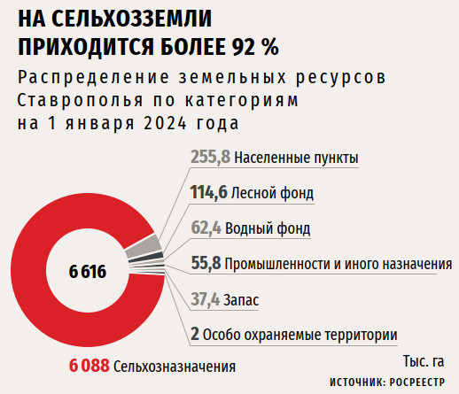 По информации Минсельхоза Ставрополья, в крае отсутствуют неиспользуемые земли сельскохозяйственного назначения. В категории крупнейших агропредприятий региона по площади пашни ведомство выделяет 12 компаний, обрабатывающих более 30 тыс. га, и 31 хозяйство, обрабатывающее более 20 тыс. га.