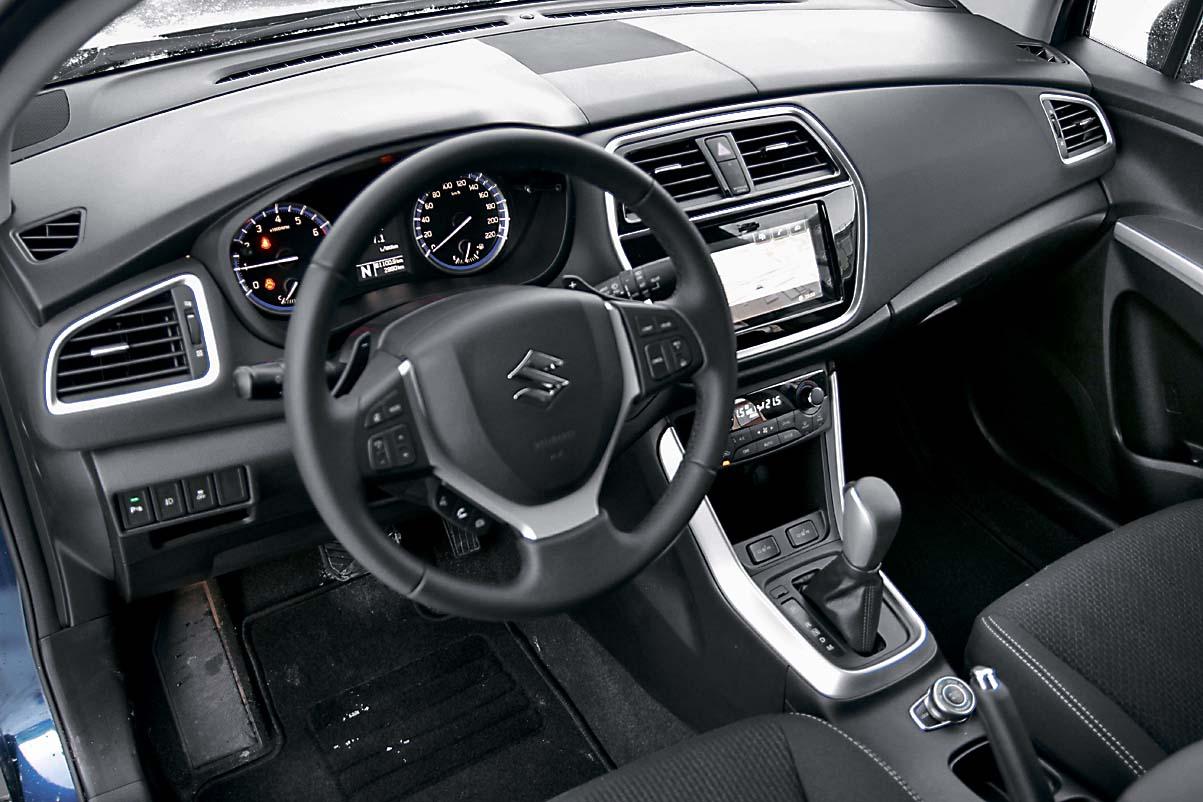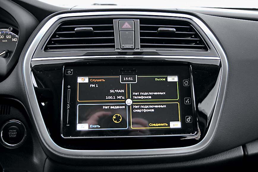 Салон Suzuki SX4 сделан достойно, но без излишеств. Панель приборов с двумя циферблатами и монохромным дисплеем можно назвать старомодной, но претензий к ее читаемости нет. Медиасистема, напротив, не имеет ни одной «аналоговой» кнопки (разве что на руле) и позволяет подключить смартфон через интерфейс CarPlay или Mirrorlink – проверено, работает. С удобством пассажиров нет особых проблем: благодаря колесной базе в 2600 мм для ног сидящих сзади остается немало пространства. В дверях (отделанных, правда, недорогим жестким пластиком) – вместительные карманы. Удобно устроен и багажник с его просторным «подпольем».