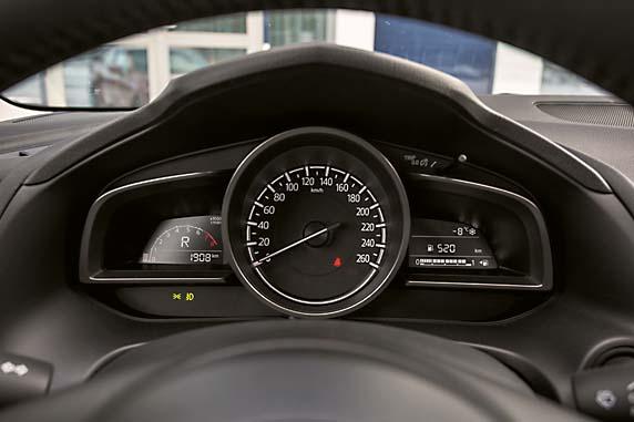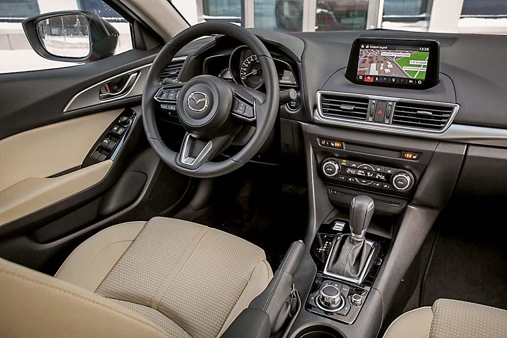 С нынешней же «Маздой» дела обстоят совсем иначе. Список оборудования радует глаз. Топовая версия Exclusive за 1 356 800 рублей, что была у нас в редакции целый месяц, оказалась богато оснащена. В холода, например, незаменимы двухзонный климат-контроль, подогрев передних кресел и – особенно – руля. Двигатель Mazda3 в мороз прогревается довольно неохотно, а вот «теплое» оборудование начинает работать практически сразу. Интерьер Mazda3 вообще дружелюбен к водителю и пассажирам. Светлая обивка сидений – настоящая находка. Редко встречающийся в суровых российских реалиях колер пришелся Mazda3 к лицу. С ним салон смотрится дорого и ярко. И материал оказался на удивление немарким – за месяц не появилось ни одного пятна. А вот с мультимедийной системой подружиться оказалось сложновато. Алгоритм ее работы не самый логичный, расстраивает и некоторая ее медлительность. Да и управление джойстиком на центральном тоннеле, успешно реализованное некоторыми конкурентами, на «Мазде» оказалось не лучшим решением. Для того, чтобы, например, ввести нужный пункт назначения в штатный навигатор, приходится совершать слишком много движений, блуждая по пунктам меню, а потом вводя точный адрес. Во время движения справится с этой задачей не так-то просто.