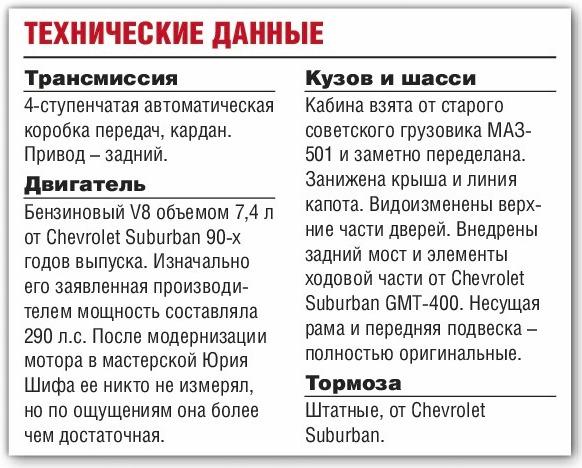 Помните, как у Высоцкого было: «Мы оба знали про маршрут, что этот МАЗ на стройках ждут...» Но этот МАЗ на стройках народного хозяйства все свое оттрубил и был бы списан в металлолом, но судьба распорядилась иначе. Известный белорусский кастомайзер Юрий Шиф приобрел его остатки за чисто символические $300 и притащил на задний двор своей мастерской – авось на что-нибудь сгодится. Идеи были, был даже карандашный набросок залихватского хот-рода, который из этого МАЗа, в принципе, можно было бы сделать. Правда, дальше рисунка дело не пошло, и МАЗ снова имел все шансы окончательно сгнить под забором. Но вновь вмешалось про-видение. Один из постоянных заказчиков мастерской Юрия Шифа приехал обсудить детали постройки своего очередного мотоцикла, и на глаза ему попался тот самый карандашный набросок. «А что, и так тоже можете?» – поинтересовался он, и работа закипела. Остатки грузовика были аккуратно разобраны, разложены по полочкам, и... большая часть из них все же отправилась в металлолом. Осталась, собственно говоря, только кабина. Ее поставили на оригинальную, специально разработанную по всем правилам автомобильной науки раму. К ее созданию, кстати, приложили руку специалисты того самого Минского автомобильного завода, на котором когда-то и был сде-лан исходный МАЗ. А вот все агрегаты пришлось подбирать новые – старые восстановлению уже не подлежали. Так у проекта появился второй донор. Им стал американский Chevrolet Suburban 90-х годов выпуска, недорого купленный на местном авторынке. У него позаимствовали 7,4-литровый двигатель V8, коробку передач, задний мост и... документы! Получилось, что автомобиль, который вы видите на фотографиях, по документам все еще считается «Субурбаном», но с «видоизмененным кузовом».