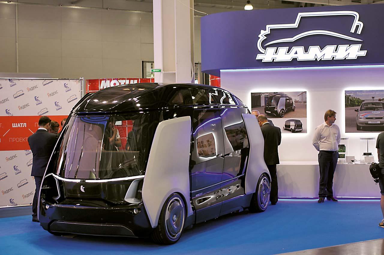 Беспилотный автобус «Шатл» разрабатывается НАМИ и КамАЗом с привлечением специалистов «Яндекса». Длина 12-местного автобуса (6 сидячих и 6 стоячих мест) составляет 4,6 м, ширина – 2 м. Максимальная скорость «Шатла» ограничена на уровне 25 км/ч. Концепция транспортной системы подразумевает, что пассажир через специальное приложение в смартфоне задает пункт назначения, а система группирует похожие запросы, формирует маршрут, сверяясь с дорожной обстановкой, и направляет самоходную капсулу к заказчикам. При этом «Шатл» может использоваться в режиме коллективного транспорта или как такси. Сначала самоуправляемые маршрутки планируется применять на закрытых территориях.