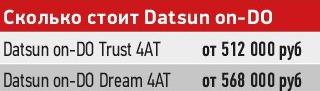 Лёгонький, массой 1160 кг, Datsun разгоняется плавно и проворно. На трассе, разумеется, сказывается ограниченный запас силенок, и на скоростях за 90 км/ч седан ускоряется с натугой, но в городе ты не чувствуешь себя обделенным. И, что приятно, машина с АКП бензина ест лишь немногим больше версии с «механикой» – в смешанном режиме 8,5 л. на сотню против 8,2 л., но шума производит заметно меньше. Даже недавнее внедрение новых шестерен полностью не избавило отечественную коробку от характерного воя, «автомат» же работает тихо и без рывков. В общем в плане комфорта, причем не только в городе, но и на трассе, АКП выглядит гораздо предпочтительней 5-ступенчатой «механики» и лишь немного проигрывает ей в экономичности. Так что появление японского «автомата» на on-DO можно только приветствовать. Правда, доплата за новоприобретенные удобства, на мой взгляд, высоковата. Седан с АКП стоит на 50 тысяч рублей дороже «ручного» собрата. А это порядка 10% стоимости всего автомобиля, что может оказаться критичным для ряда покупателей.