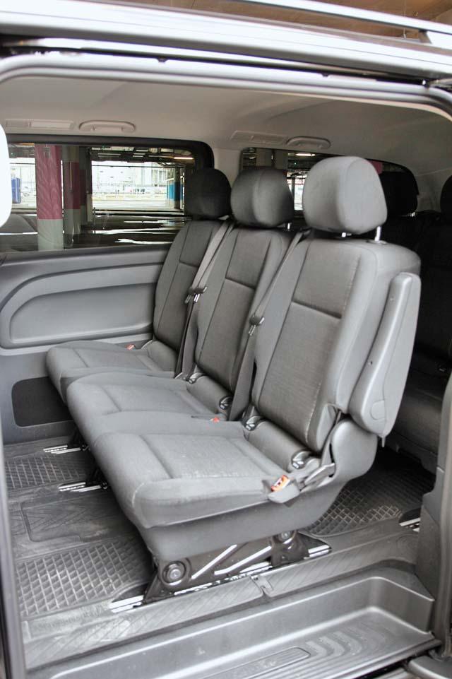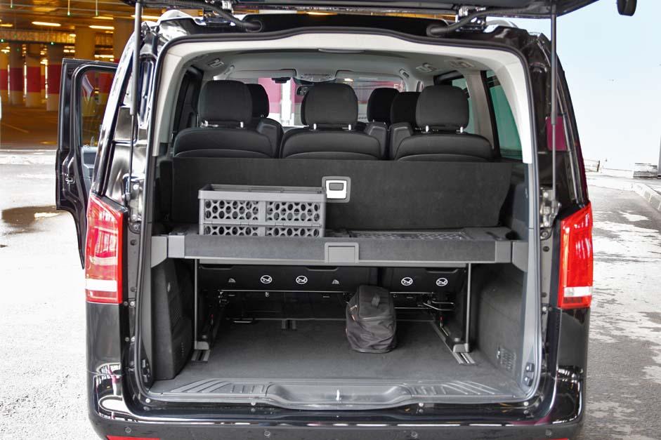 Пассажирам в длиннобазном Vito не приходится тесниться: места для ног хватает с запасом и во втором, и в третьем ряду даже высоким людям. Разве что в плечах не так уж просторно. Багажный отсек делится пополам откидной полкой, в толще которой под крышкой спрятаны складные пластиковые ящики для мелких вещей. Не багажник, мечта такелажника!