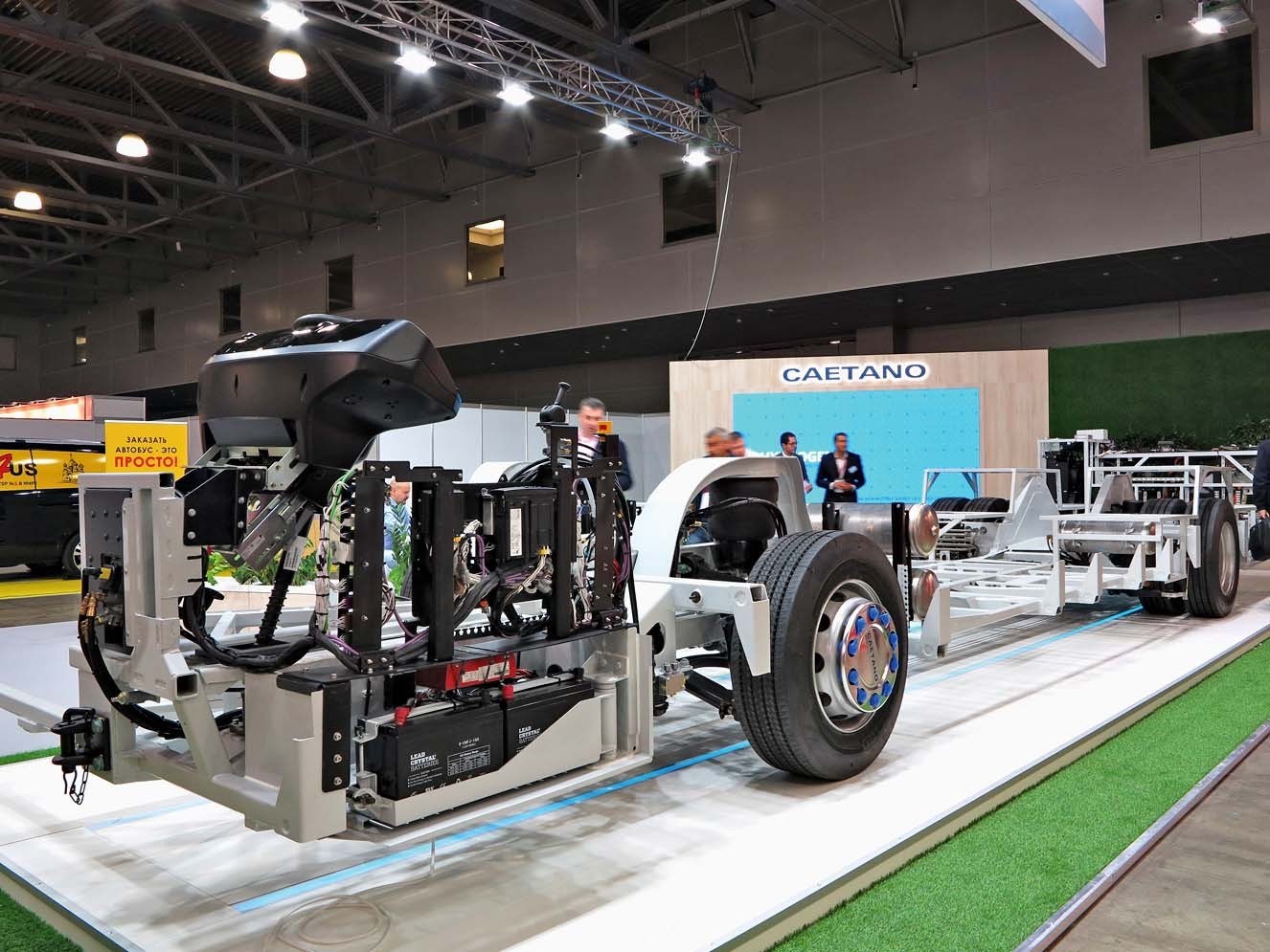 Эта португальская компания с 2014 года специализируется на разработке технологий для производства электробусов. В Москве CAETANO представила свою последнюю разработку – 12-метровое низкопольное шасси СС 100, расчитанное на 88 пассажиров, полная масса электробуса – до 19 тонн. Рама изготовлена из высокопрочных сталей. В задней части синхронный электродвигатель Siemens PM: 700 В/160 кВт, блок управления и трансмиссия Siemens Elfa. Здесь также расположена мощная система охлаждения. Зарядка батарей производится током в 200 А. Стоимость без «кормовой» начинки 150 000 евро, а с ней и литий-ионными батареями 450 000 евро.
