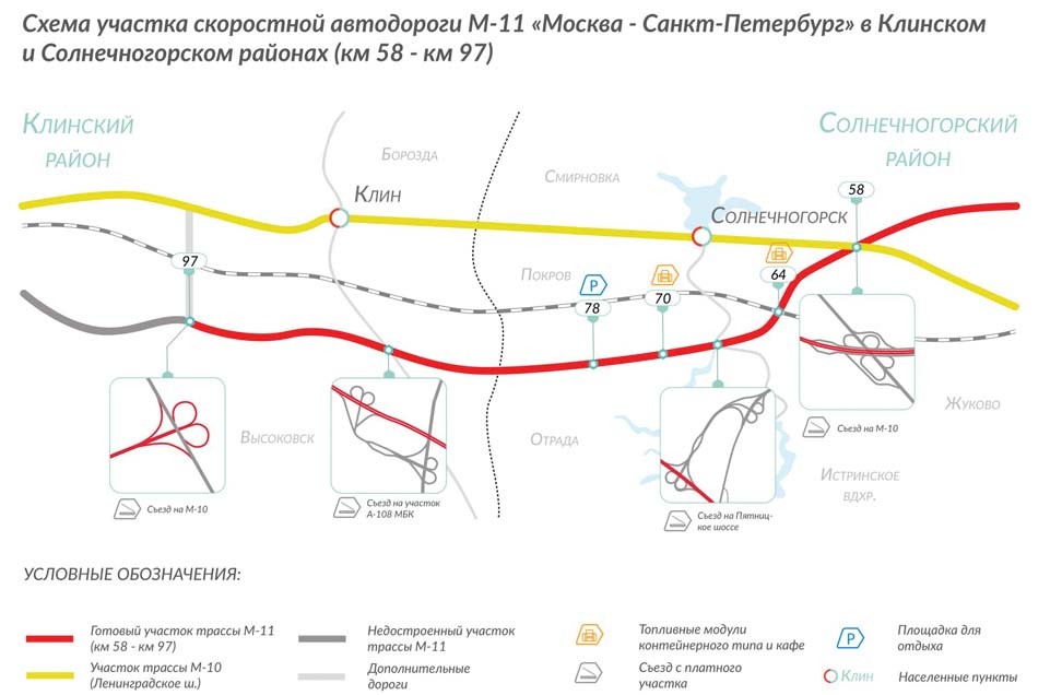 Вздохнуть свободнее смогли не только жители подмосковного Клина и Солнечногорска, задыхавшихся в прямом и переносном смыслах от транзитного транспорта, но и многочисленные окрестные дачники, обреченные стоять в пробках на М-10. Первого сентября запущено движение на участке трассы М-11 «Москва – Санкт-Петербург» с 58 по 97 километр. Новый отрезок дополнит уже действующий платный участок М-11 от МКАД до Солнечногорска (15-58 км). Дорога с 97 по 208 км пока не запущена (обход Твери введут в строй еще не скоро), а далее идут несколько функционирующих участков вплоть до 543 км в Новгородской области. Подъезд к Санкт-Петербургу тоже до сих пор не работает. Оказалось, что это наиболее проблемный участок трассы, начиная с поиска подрядчиков. После окончания строительства протяженность трассы от МКАД до петербуржской КАД составит 669 км. Расчетная скорость на некоторых отрезках уже сейчас достигает 150 км/ч. А бесплатной альтернативой новому автобану остается трасса М-10 «Россия».