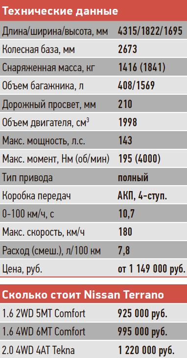 Нам довелось прокатиться на 2,0-литровом полноприводном кроссовере в топовой версии Tekna, со всеми описанными ниже обновлениями. Terrano ездит по-прежнему: на трассе бодро, а вне ее даже со вкусом. Изображение с камеры заднего вида выводится теперь на 7-дюймовый (против прежнего 5-дюймового) дисплей. Браться за новый руль с наплывами намного приятнее, выгоды круиз-контроля по нынешним «камерным» временам объяснять не нужно. К новым более анатомичным передним сиденьям привыкать не пришлось, сидишь как влитой. Не хватает лишь подлокотника посередине. Словом, Terrano явно движется в правильном направлении. Из приятных и необходимых новых опций отметим электрообогрев лобового стекла и дистанционный запуск двигателя (для версий с АКП). Завести мотор можно с помощью кнопки на ключе или запрограммировав время старта на бортовом компьютере. Чисто зимняя история.