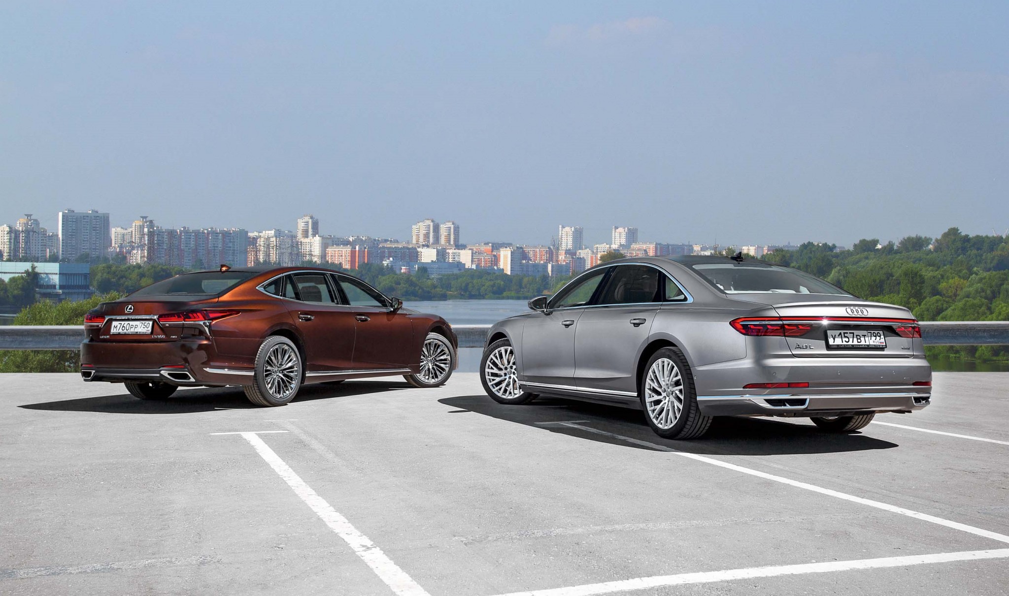 Наряду с преимуществом в мощности Lexus и весит побольше, и на ходу это ощущается – удлиненная Audi воспринимается менее тяжеловесной, хотя в спокойном режиме передвижения коробка A8 меняет передачи чуть более заметно. Все же 10-скоростная АКП в Lexus ведет себя почти как вариатор. Управляемость надежна у обеих машин, но все же отклик Audi на действия стоит признать более чистым.