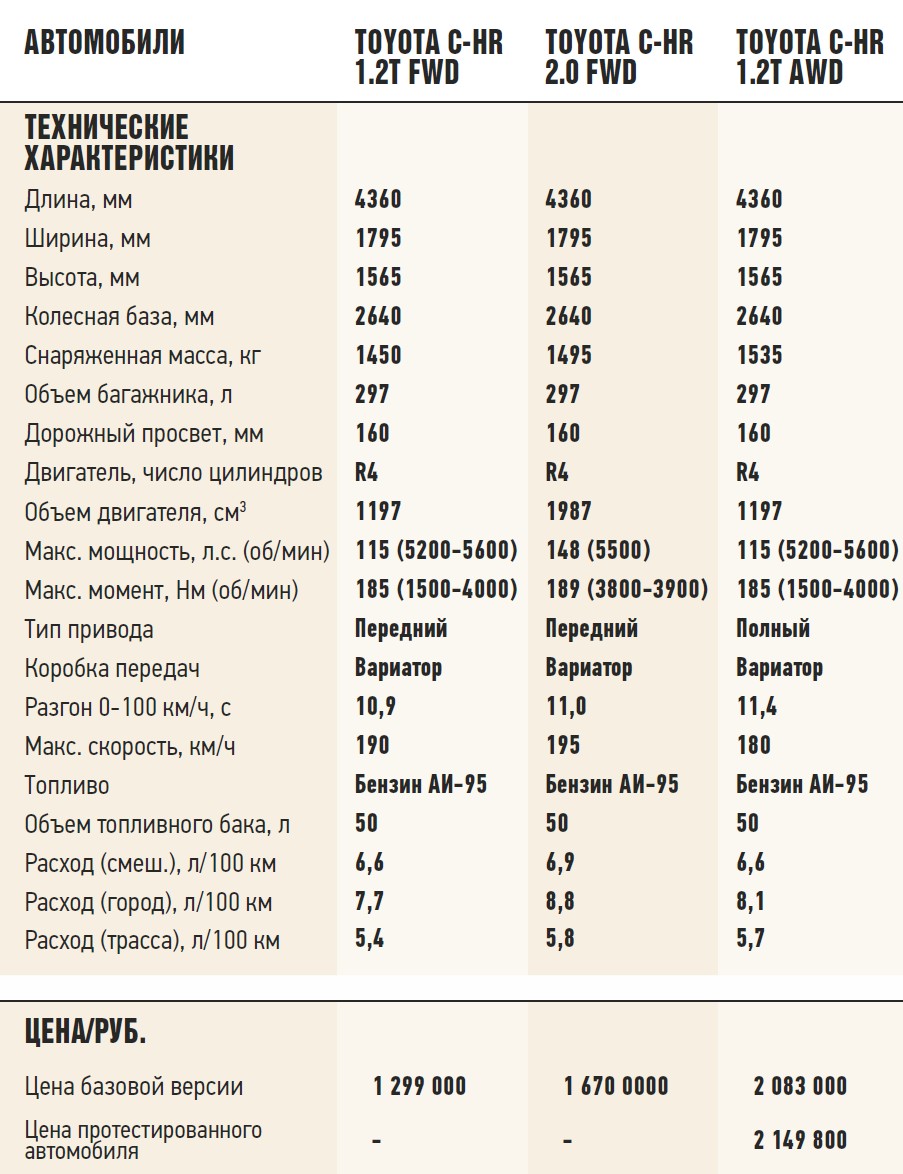 Зато диван приятно удивил. Скромные габариты автомобиля и ниспадающая к корме крыша не помешали мне принять комфортную позу. При этом компоновщики и для багажа выкроили место. Недельный запас продуктов из супермаркета или детская коляска поместятся в С-HR без проблем, а для перевозки длинномеров можно сложить спинки заднего сиденья. Для стильной городской машины лучшего и не пожелаешь. Я бы взял такой яркий и неординарный кроссовер для супруги. Но не верхнюю комплектацию за два с хвостиком миллиона рублей. Положенный только ей полный привод безусловно хороший помощник на скользком асфальте, но небольшой дорожный просвет в 160 мм и короткоходная подвеска не сулят ничего хорошего даже не на самом серьезном бездорожье. Да и малолитражный турбомотор – не самый привлекательный актив в долгосрочной перспективе. Средняя по оснащению версия Hot мне много симпатичнее. И ничего, что монопривод, зато безнаддувный 2,0-литровый двигатель и цена в 1 670 000 рублей в нынешних реалиях уже не выглядит шокирующей.