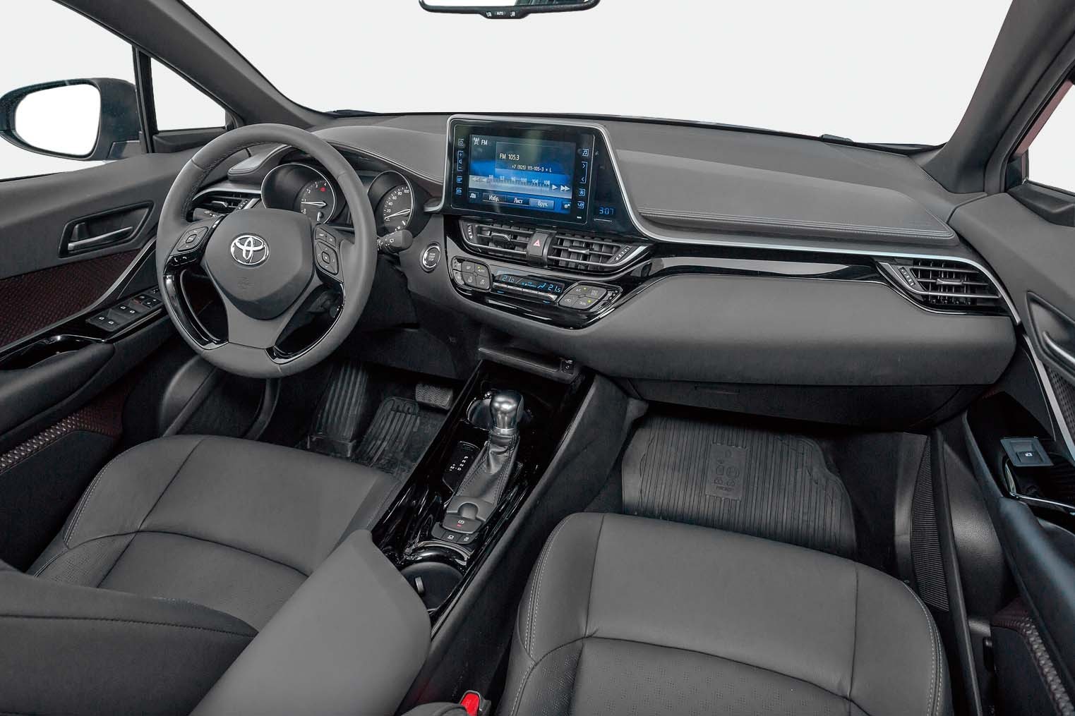 Салону тоже досталось от дизайнеров, но в целом интерьер выглядит не так нарочито, как экстерьер. Круглые аналоговые приборы в глубоких колодцах, трехспицевая «баранка» и повернутая к водителю центральная консоль выступают за спорт. Качественные материалы отделки и богатое (в случае топовой комплектации Сool) оснащение как бы советуют – на низкую цену не рассчитывать. А я и не буду, но сообщу, что за рулем мне, крупному дядьке ростом 185 см, было вполне удобно, не возникло у меня вопросов к расположению кнопок и меню мультимедийного комплекса Toyota Touch 2. Свои претензии я могу изложить лишь по трем пунктам. Это «притягивающий» отпечатки пальцев глянцевый экран вышеназванной информационно-развлекательной системы, отсутствие физической ручки регулировки громкости, а самое главное – ограниченная массивными задними стойками и узкими дверными окошками обзорность.
