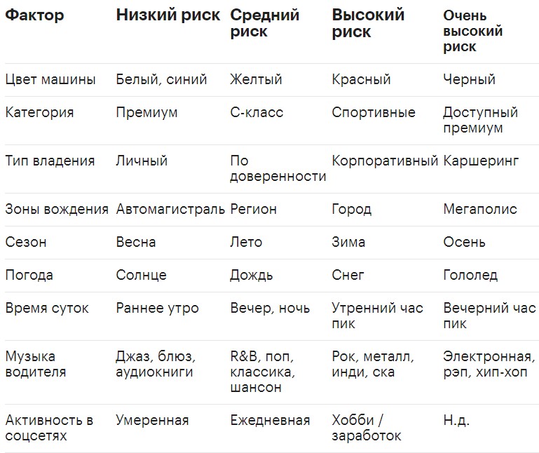 Среди факторов, которые могут повлиять на наступление дорожной аварии, аналитики выделили как погодные явления и время суток, так и цвет, стоимость автомобиля, добавив в таблицу и личные предпочтения водителя по музыке и отношению к курению и алкоголю. Согласно данным исследования, самыми опасными участниками дорожного движения являются черные и красные автомобили каршеринга доступного премиума (Toyota Camry, BMW 3), которыми управляют водители с положительным отношением к алкоголю и с увлечением электронной музыкой, рэпом или хип-хопом. Наиболее опасный возраст водителя — 18-20 лет.