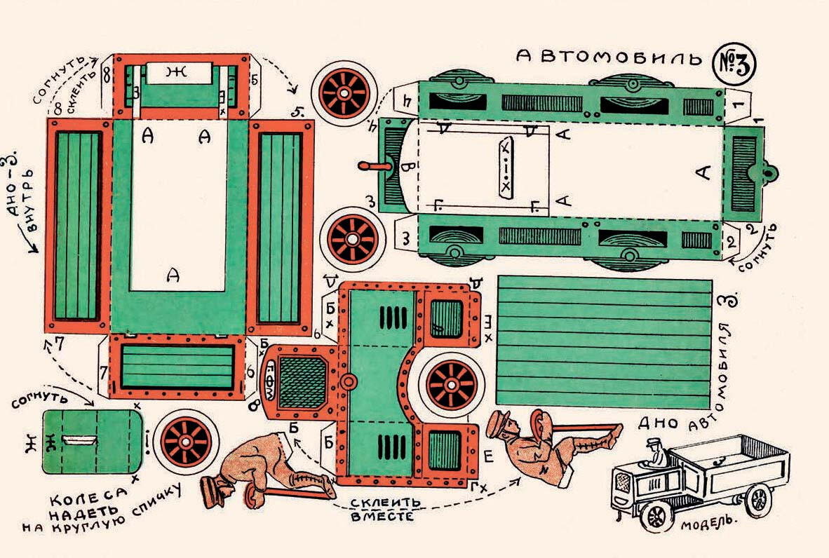 Одно из самых ранних подобных изданий – «Давайте склеивать. Альбом игрушек из бумаги» – выпущено в Москве в 1925 году. Это обычный альбом формата А4 с напечатанными на листах раскройками, которые требовалось вырезать, согнуть и склеить. Издание было периодическим, но только в восьмом номере детям предлагалось склеить автомобиль, причем наряду с пароходом, самолетом и осликом, запряженным в повозку.