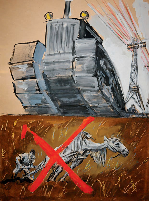 Железный конь идет на смену крестьянской лошадке. Но почему-то в роли «железного коня» – какой-то иностранный гусеничный трактор, а не советский «Сталинец». На заднем плане Кукрыниксы нарисовали вышку ЛЭП, попутно намекнув и на электрификацию всей страны.
