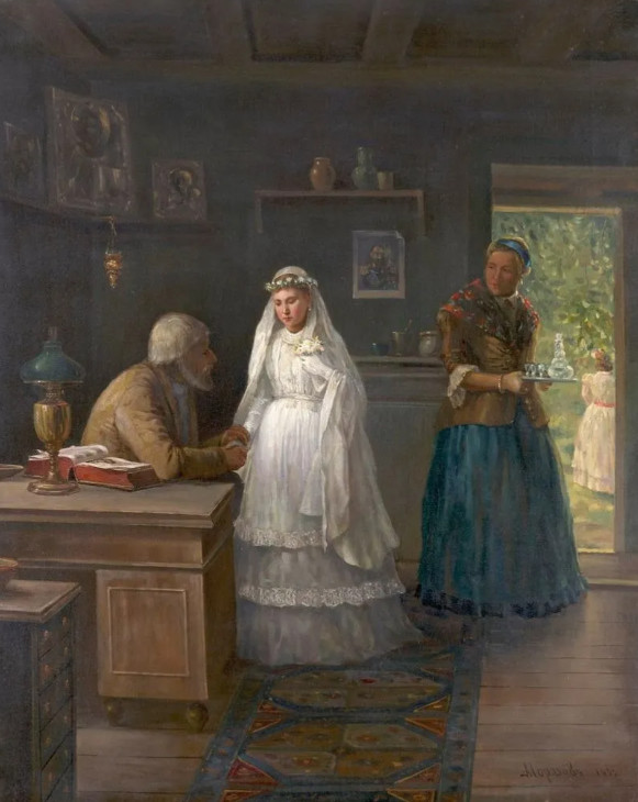 Венчание в XIX веке, в отличие от нашего времени, было ритуалом, закрепляющим брак юридически. На венчании обязательно присутствовали свидетели (поручители), головы молодых покрывали церковными венцами, в конце обряда священник надевал кольца, которые предварительно, за несколько дней до свадьбы, приносил в церковь жених.
