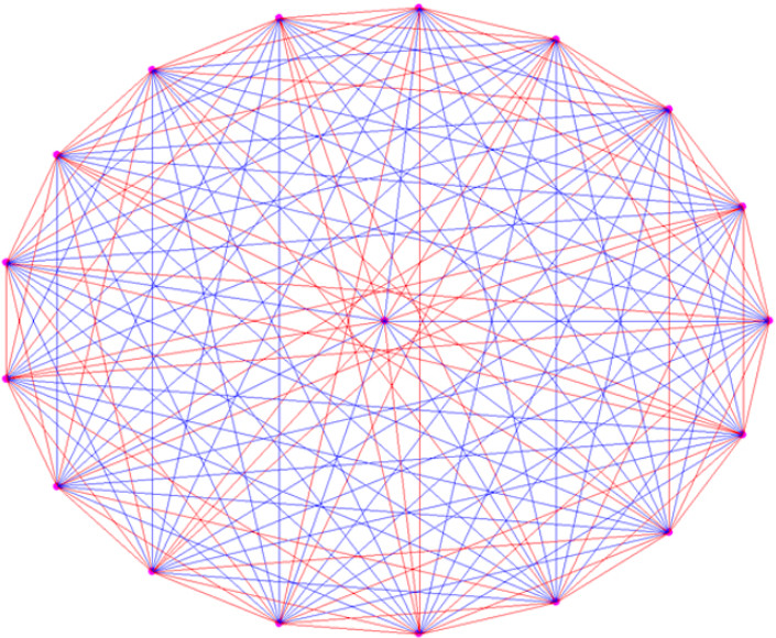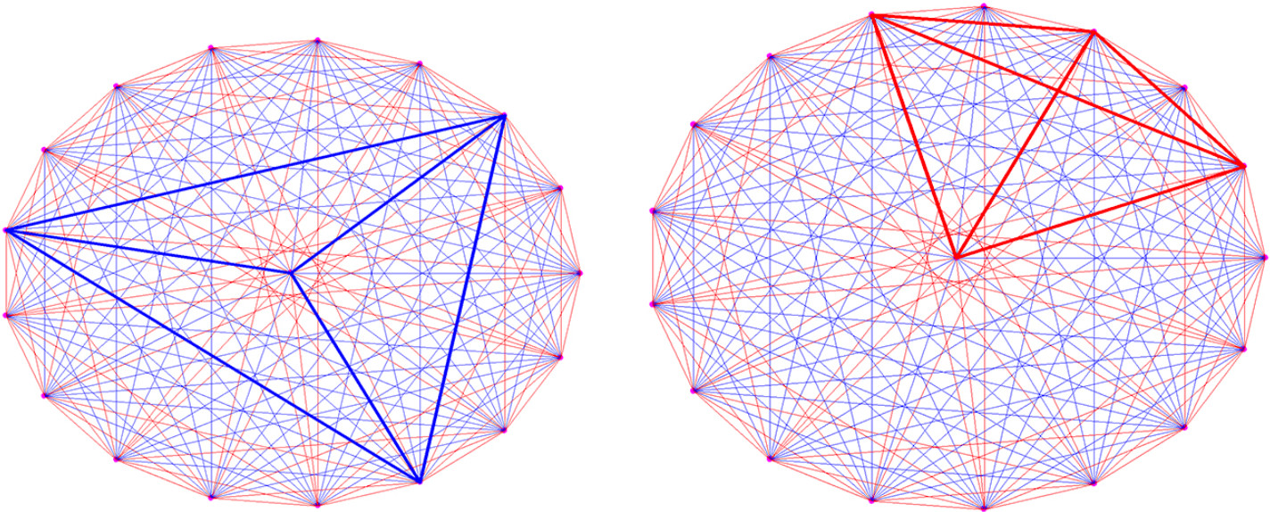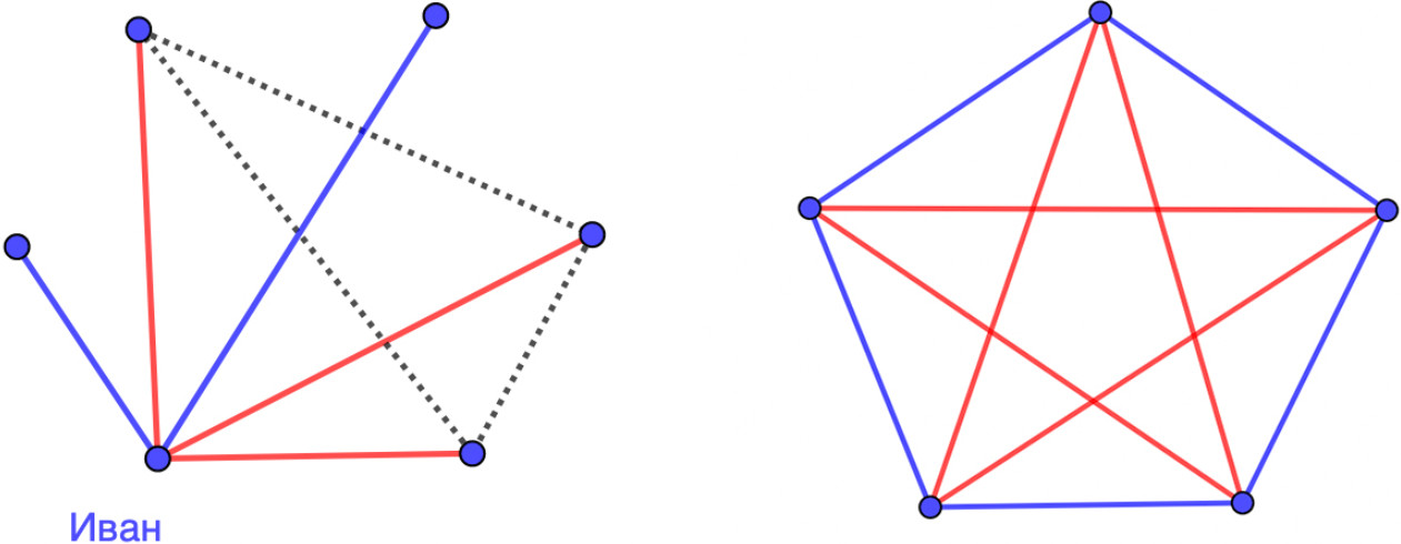 Следовательно, здесь найдутся 4 вершины соединенные либо только красными, либо только синими ребрами. Попробуйте найти такую четверку! john doe
