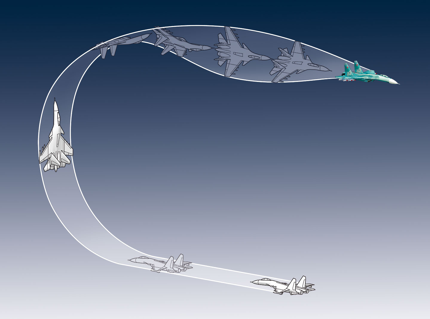 Как: Самолет делает боевой разворот — полубочку в верхней части полупетли.