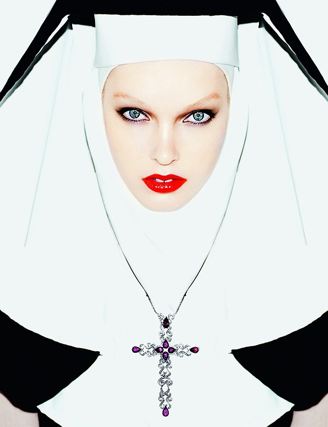 Постмодернистские 1980-е позволили дизайнерам обращаться с религиозной символикой запросто — гигантские кресты, украшенные разноцветными камнями и стразами, стали любимым модным украшением. А знаменитая обложка американского Vogue 1988 года, на которой кутюрный топ Кристиана Лакруа с вышитым во всю грудь крестом был надет со стираными джинсами Guess, вообще открыла новую эру во взаимоотношениях высокого и низкого, сакрального и бытового. И то, что это была первая обложка Анны Винтур в качестве главного редактора американского Vogue, лишь четче обозначило все эти вехи. Конечно, 1990-е с их раскрепощенностью могли позволить Жан-Полю Готье вышивать осененный нимбом лик Христа на поясах-триптихах в зимней коллекции Haute Couture 1997, а Александру Маккуину в том же году — поместить фрагменты ренессансного распятия на сложнейшего кроя жакет, превращая церковную живопись XV века в замысловатый принт. Ну и конечно,