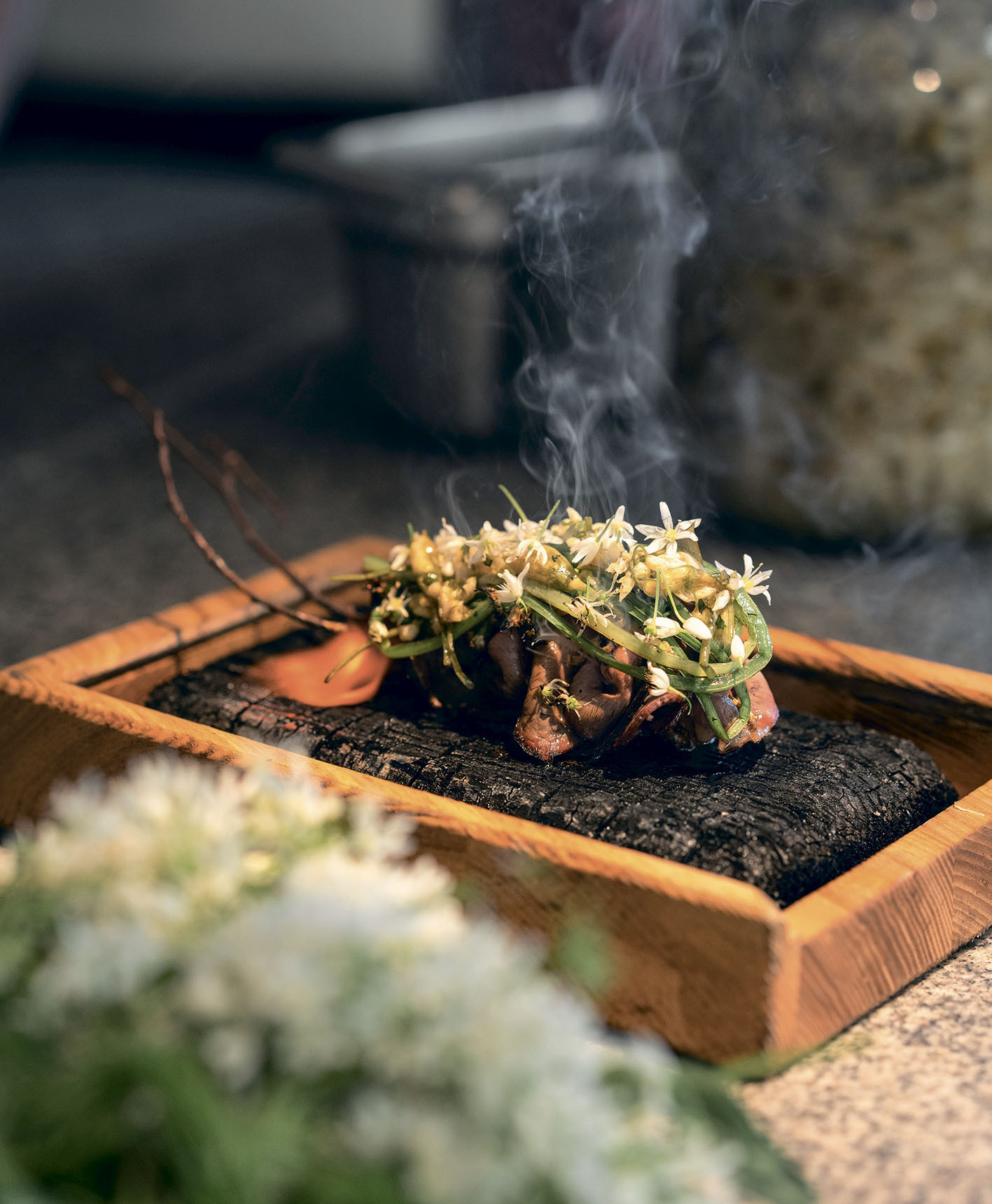 Сердце нарезать с помощью слайсера тонкими слайсами, насадить на березовую ветку, сверху — обжаренную черемшу и цветы акации. Украсить цветами черемши.