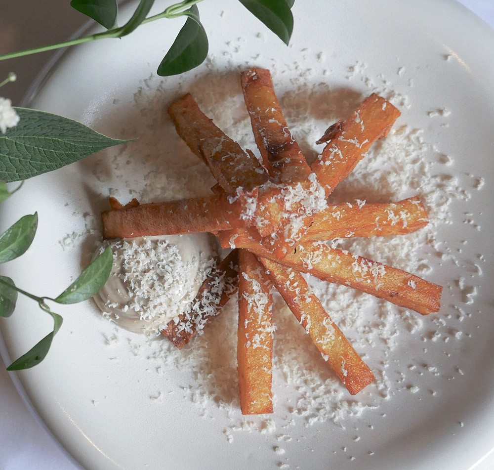 Готовый гратен нарезать в форме картофеля фри и обжарить во фритюре до золотистого цвета. Обсушить и выложить на тарелку. Рядом отсадить трюфельный соус и посыпать тертым пармезаном.