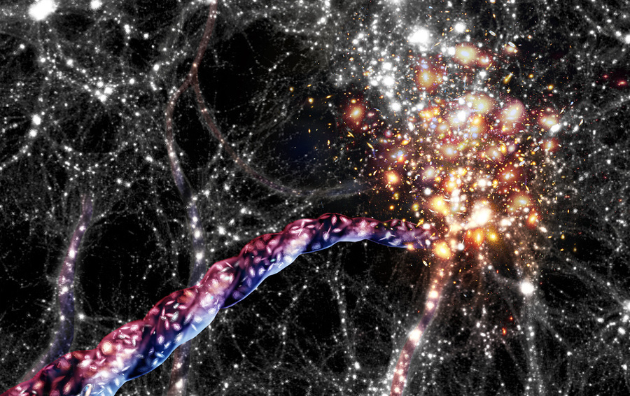 Когда Вселенная возникла в результате Большого взрыва, она была очень однородной. Ни одну точку новорожденного космоса нельзя было отличить от любой другой. Существовали лишь крошечные различия в плотности материи. Эти мизерные уплотнения стали зародышами грандиозной космической структуры, наблюдаемой сегодня. Ведь там, где больше плотность вещества, сильнее гравитация. А гравитация притягивает окружающую материю, и в результате плотность становится еще больше. Это замкнутый круг, из-за которого изначально крошечная неоднородность растет, как снежный ком.