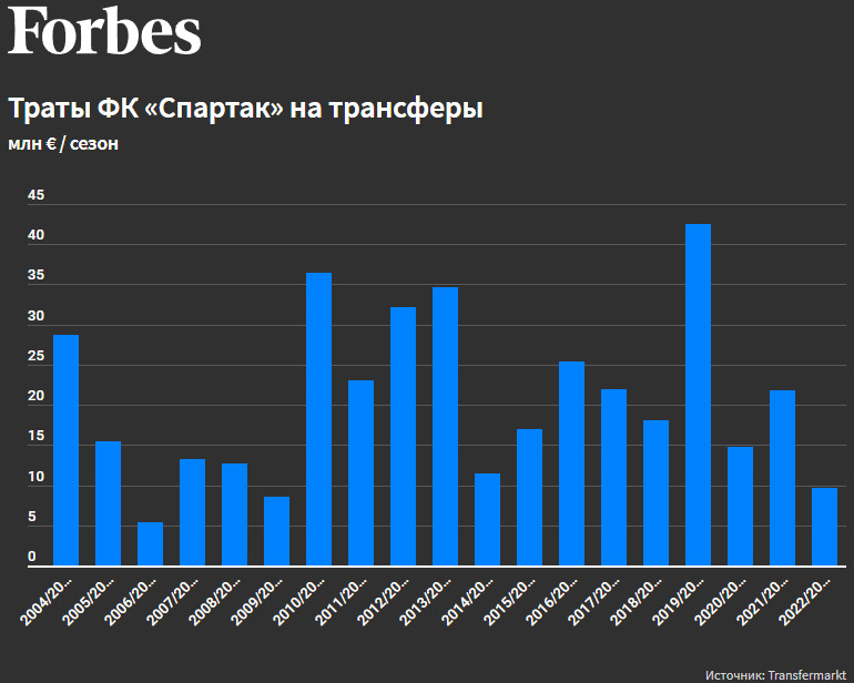 Если в 2003 году бюджет «Спартака» составлял всего $15 млн, ЦСКА — $30 млн, «Локомотива» — $23 млн, то через год расходы красно-белых выросли до $40 млн. В сезоне-2005 «Спартак» занял вторую строчку в турнирной таблице российской премьер-лиги, но впервые с 1986 года остался без еврокубков, которые приносят дополнительные трофеи и доходы.