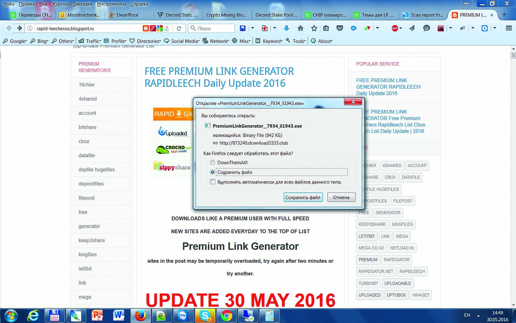 Излюбленным пунктом отправления приверженцев культуры бесплатного являются известные файлообменники — такие как, например, Uploaded.to. Загрузка фильмов, музыки и электронных книг не влечет за собой практически никаких правовых рисков, поскольку юридическим институтам сложно получить доступ к информации о пользователе, который скачивает контент. Зачастую подобные файлообменники предлагают бесплатный режим, связанный, однако, с ограничением по времени и скорости. Высокая скорость загрузки и крупные файлы доступны лишь за деньги. Можно, впрочем, найти такой сервис, как leechbb.com, обещающий премиум-доступ к файлообменникам. Для этого необходимо ввести загрузочную ссылку к файлу с фильмом или музыкой, и все пройдет как по маслу. Якобы. Однако на самом деле сервис отправляет вас на страницу, где сверкает крупная кнопка, нажатие на которую запускает загрузку премиум-генератора в виде файла EXE. И сразу же после запуска вы получаете упакованный в EXE троян с бесплатной доставкой на дом. Если после распаковки антивирус забьет тревогу и запрячет вирус в карантин — считайте, что вам крупно повезло.