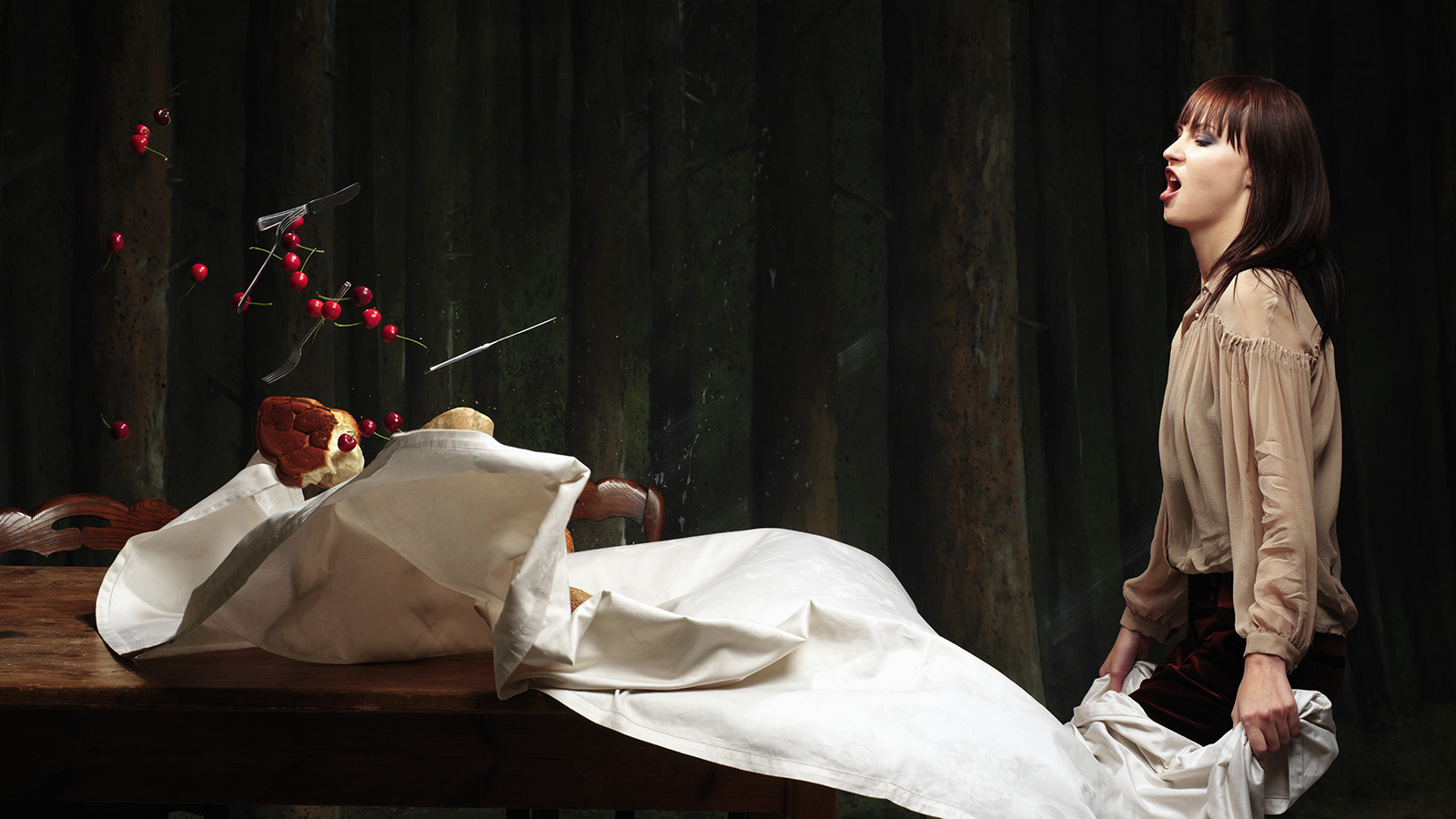 Женщина идет по улице, и мужчина говорит ей, что неплохо было бы улыбнуться. Она улыбается, обнажая клыки. Откусывает мужчине руку, хрустит костями, выплевывает их. Но случайно проглатывает обручальное кольцо, от которого потом мучается изжогой.