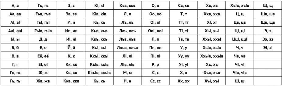 Арчинский принадлежит к числу лезгинских языков, и, как считают ученые, выделился как самостоятельный язык примерно в VI веке до н. э., в то время как древнерусский язык, предок современного русского, образовался примерно в VII–VIII в. н. э. И вот арчинский-то по-настоящему сложен, по всем статьям. Во-первых, фонетика: в арчинском языке порядка восьмидесяти фонем, из которых семьдесят — согласные (в литературном русском пять гласных и 37 согласных фонем). Как передать это на письме? До 2006 года носители языка не задумывались об этом и прекрасно обходились без письменности, пока лингвисты из МГУ не создали для арчинского языка алфавит на основе кириллицы без диакритических знаков.