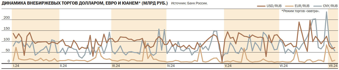 Уникальность ситуации в том, что, помимо перетока на внебиржевой рынок ликвидности «токсичных» валют, частично ушла и юаневая ликвидность. Если раньше юань занимал на внебиржевом рынке немногим более 39%, уступая доллару 6 п. п., то к концу июня почти догнал его. По оценке «Денег», основанной на данных Банка России, суммарный объем торгов валютной парой USD/RUB составил по итогам июня 2,03 трлн руб., что на 13% ниже показателя мая. Такое снижение, по мнению главного аналитика Совкомбанка Михаила Васильева, закономерно с учетом еще большей «токсичности» доллара и ограниченного доступа к внебиржевому рынку, основными игроками на котором являются банки. Объемы торгов в паре CNY/RUB выросли на внебирже на 27%, до 1,98 трлн руб.— второй по величине результат за все время наблюдений.