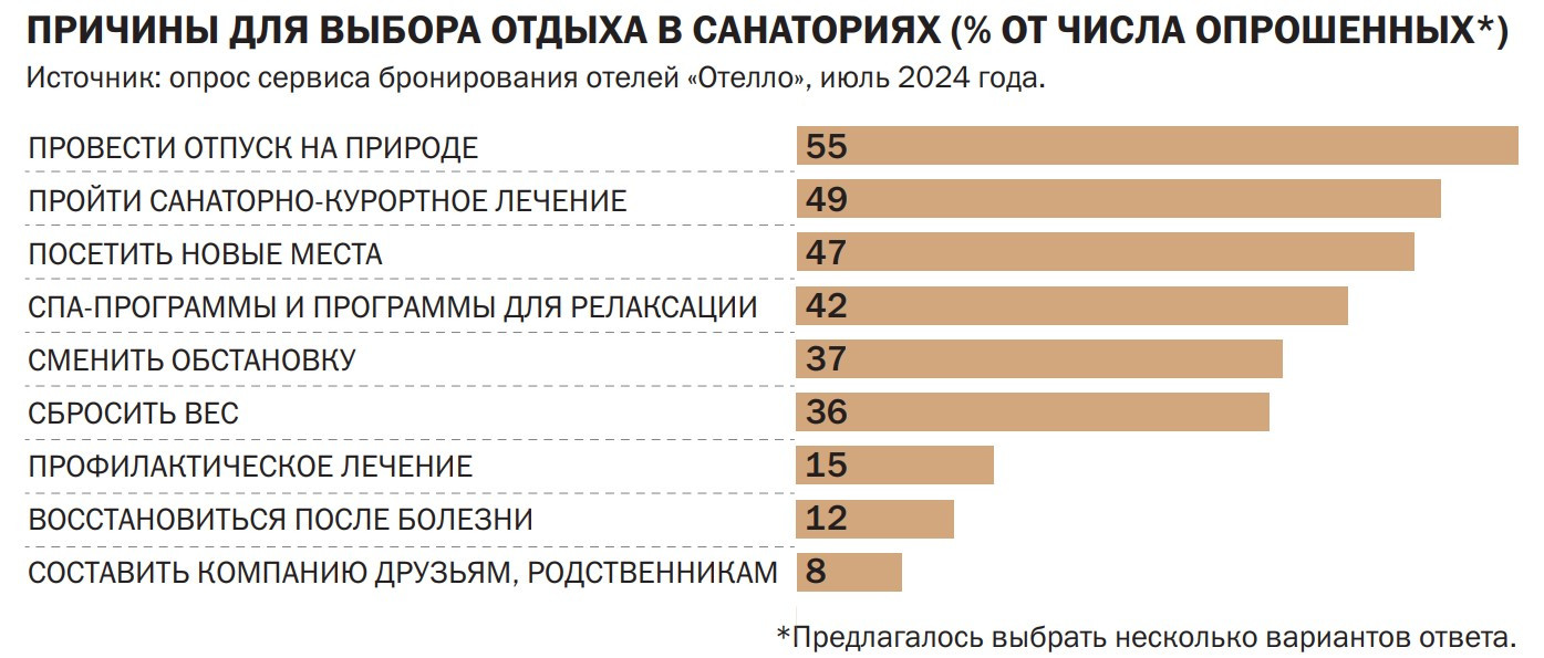В системе бронирования «Островок» долю санаториев в общей структуре спроса при этом называют стабильной — сегмент формирует 1% продаж. Зато средняя продолжительность отдыха растет. Если прошлой осенью в здравницах останавливались в среднем на четыре ночи, в октябре—декабре этого года поездка обычно растягивается на пять. Растущая цена оздоровительного отдыха при этом, вероятно, мало пугает российских путешественников.