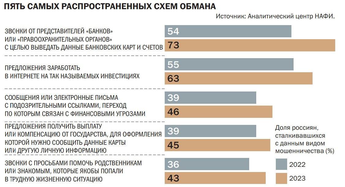 По данным опроса Аналитического центра НАФИ, за прошлый год в России на 9 процентных пунктов (п. п.) выросла доля тех, кто сталкивался с попытками мошенничества (91%). Если в 2022 году каждый житель страны сталкивался в среднем с тремя схемами мошенничества, то в 2023-м — уже с четырьмя.