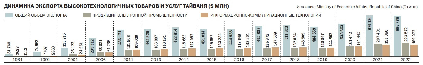 Военный конфликт вокруг Тайваня, если произойдет, по оценке аналитиков Bloomberg Economics, нанесет мировой экономике ущерб в размере $10 трлн, что примерно соответствует 10% ВВП всей планеты. Тайвань — крупнейший в мире производитель чипов (60% мирового производства полупроводников и более 90% производства самых передовых полупроводников). Тайваньские чипы можно найти практически в любой современной технике — смартфонах, компьютерах, стиральных машинах, автомобилях, военных и гражданских самолетах и т. д. Еще полвека назад высокими технологиями на Тайване и не пахло: новая индустрия была построена с нуля.