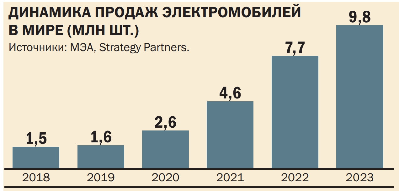 Глобальные продажи BEV в прошлом году оказались на 27% больше, чем показатели 2022 года, когда было реализовано 7,7 млн электрокаров. Внешне прирост выглядит значимым, но замедление динамики налицо: она в 2,5 раза меньше, чем в позапрошлом году, и втрое — чем двумя годами ранее (в 2022 году глобальный рост продаж BEV составлял 67%, а в 2021-м — 77%). Еще меньшая динамика ожидается в текущем году: консалтинговая компания Strategy Partners предсказывает, что прирост электрокаров на дорогах составит 20%.