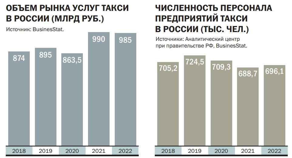 До последнего времени объем рынка услуг такси в России рос довольно динамично. По оценкам аналитической компании BusinesStat, в 2019 году общая выручка операторов такси в России достигла 895 млрд руб., что на 16% больше, чем годом ранее. Правда, по отрасли ударила пандемия коронавируса: в 2020 году объем рынка сжался на 3,5%, до 863,5 млрд руб. Но в 2021 году рынок отыграл сокращение и вырос на 14,6%, до 990 млрд руб.
