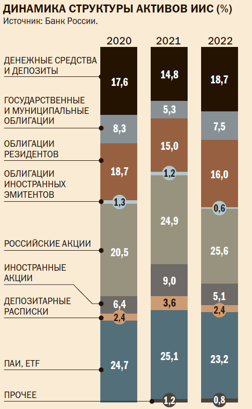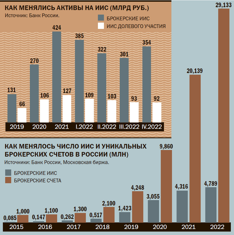 Одним из важнейших этапов в популяризации финансовых инвестиций среди населения стало внедрение в 2015 году индивидуальных инвестиционных счетов (ИИС). В 2015–2017 годах почти все счета, открытые на Московской бирже, были данного типа (менее 100 тыс. счетов). В конце 2022 года общее число ИИС составило 4,8 млн с суммарными активами 354 млрд руб. Появление ИИС сделало инвестиции в фондовый рынок проще, понятнее, доступнее. При открытии такого счета частный инвестор может выбрать один из двух видов налоговых вычетов. Вычет первого типа предоставляется на взносы до 400 тыс. руб. в год, с которых человеку возвращают уплаченный НДФЛ в размере 13% (до 52 тыс. руб.), такой инструмент получил название ИИС-1. Вычет второго типа предоставляется на доход, полученный инвестором; инструмент, соответственно, назвали ИИС-2. Льготы предоставляются при условии действия счета не менее трех лет.