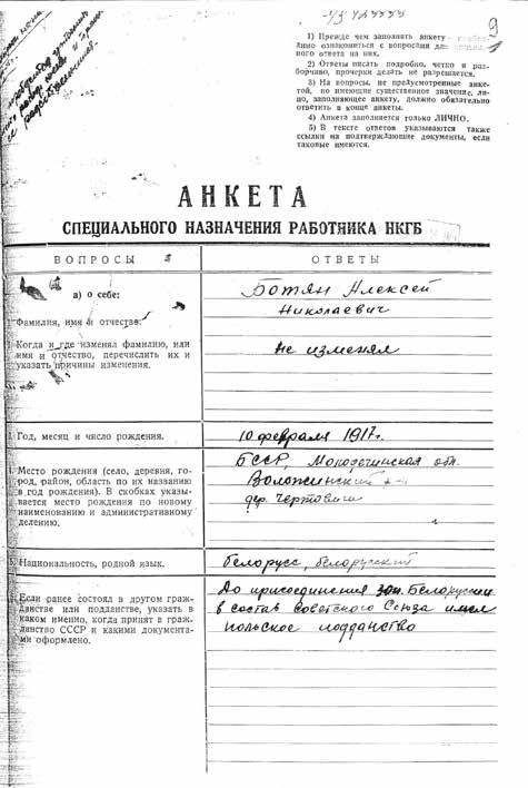 …В мае 1941-го направленный на учёбу в Высшую разведшколу, Алексей Ботян уже в июле был зачислен в Отдельную мотострелковую бригаду особого назначения (ОМСБОН) 1 . А в 1942-м направлен в западные районы Белоруссии и Украины, в тыл врага, в должности заместителя по разведке командира партизанского соединения Виктора Карасёва.
