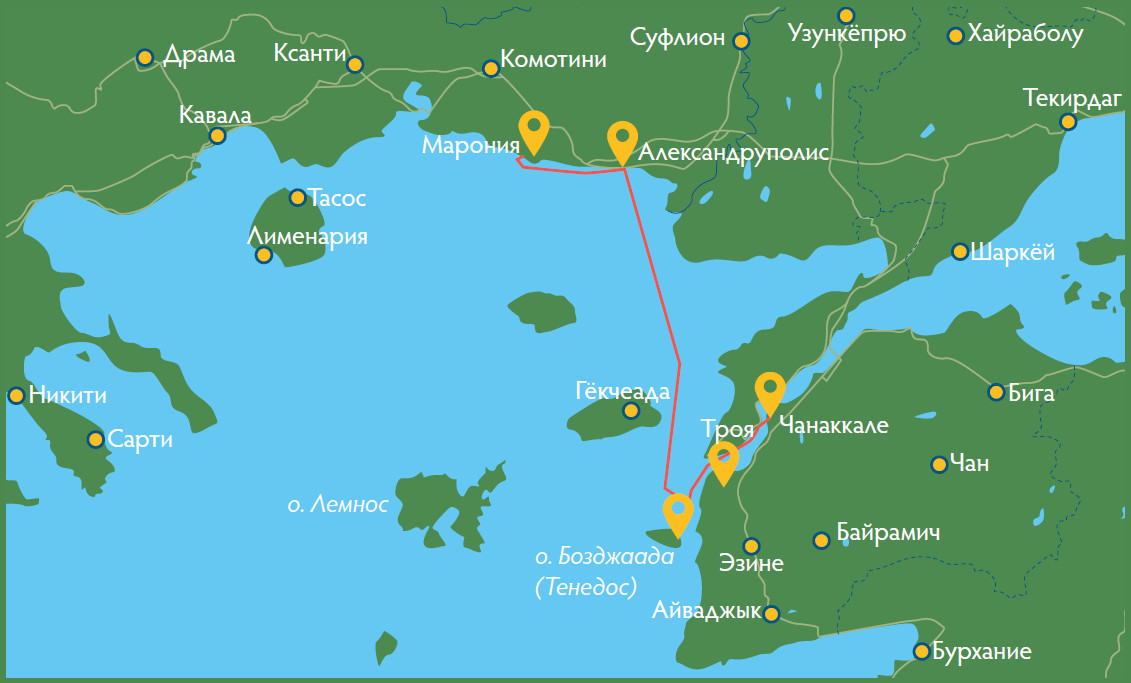 Что стоит за этой историей? Мы обсуждали её, идя под парусами от Трои к острову Тенедос. Попутные волны из Дарданелл, а главное, бодрый северный ветер, с хорошей скоростью несли нас вперёд. Мы в который раз убеждались: ходить по Эгейскому морю проще всего с севера на юг.