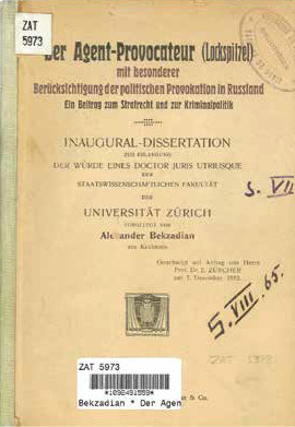 Работа выпускника Цюрихского университета и соискателя степени доктора права, довольно абстрактно обозначенного на обложке как «уроженца Кавказа», — основана на трудах виднейших юристов Европы, прежде всего — немецких. Однако, предоставив подробный обзор событий в России, имеющих признаки политической провокации, Бекзадян задаётся вопросами: достаточно ли чётко мы понимаем, кто такой «агент-провокатор»? Просто шпион, как пишут в словарях? Преступны ли его действия? Есть ли законы, по которым его может судить государство? Вот, что писал Бекзадян: