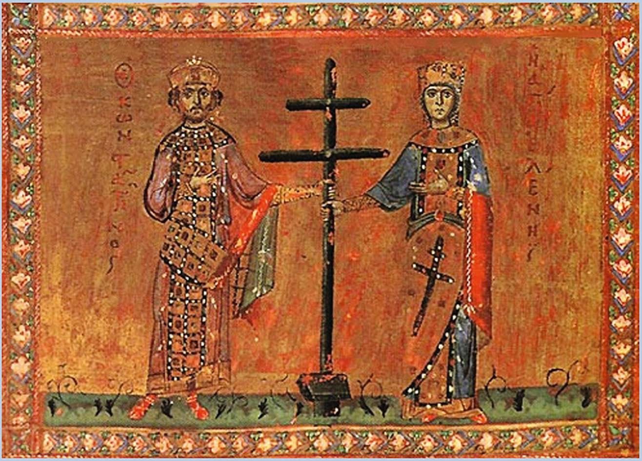 Этот крест вначале назывался «патриаршим». Согласно преданию, в начале IV века святая Елена, мать Константина, первого римского императора-хри-стианина, отправилась в Иерусалим, где обнаружила главные реликвии Господних Страстей: гроб, крест, четыре гвоздя и табличку INRI («Иисус Назарянин Царь Иудейский»). И вот в честь их обретения восточные патриархи стали использовать шестиконечный крест, верхняя перекладина которого представляет собой знаменитое титло.