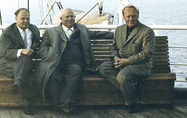 Павел Сатюков, главный редактор газеты «Правда», Никита Хрущёв и Алексей Аджубей, главный редактор газеты «Известия» (слева направо) на лайнере «Балтика» на пути в Нью-Йорк. Сентябрь 1960 года