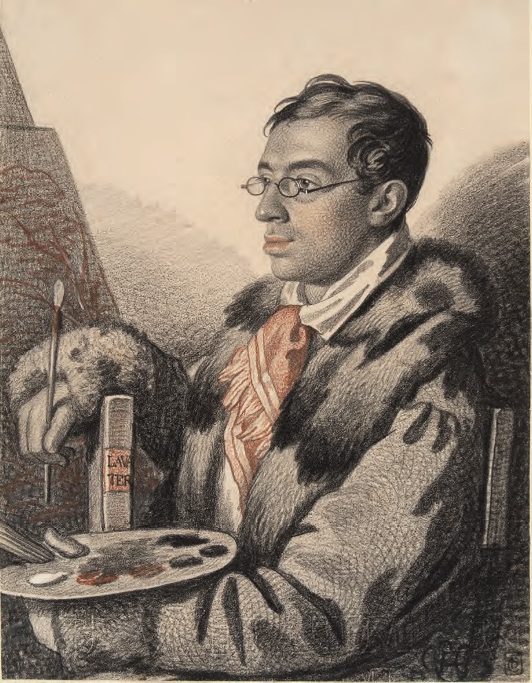 Моё внимание на выставке привлёк замечательный рисунок из собрания ГМИИ имени А. С. Пушкина, изображающий молодого обер-офицера армейской конной артиллерии. На картоне, прикрывающем оборот оригинала, читается надпись карандашом: «Гампельн / молодой граф / Новосильцев». Авторство рисунка не вызывает никаких сомнений. Тем более глухонемой художник поставил в нижнем углу свою знаменитую подпись — монограмму из латинских букв CH и слово Sourdmuet (глухонемой).