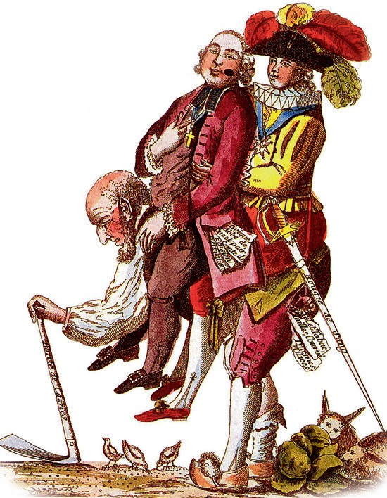 На карикатуре. В середине XVIII века, задолго до начала Великой французской революции, среди представителей третьего сословия были популярны карикатуры, на которых дворяне и священнослужители изображались как нахлебники, восседающие на горбу крестьянина, который даже не имеет сил прогнать птиц и кроликов, пожирающих его урожай