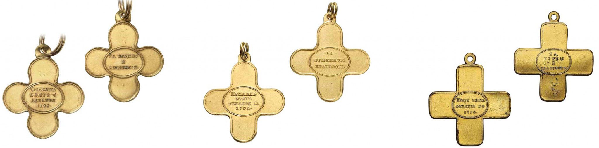 С тех пор аналогичные золотые кресты императрица дважды жаловала при громких победах: за покорение Суворовым Измаила 11 декабря 1790 года и штурм варшавского предместья Праги 24 октября 1794 года, после которого Варшава сдалась. Причём за Измаил выбили ровно столько же крестов, сколько и за Очаков, — 410 штук, хотя офицеров участвовало 860. С крестом за Варшаву и вовсе вышел конфуз. Пока собирали списки и выяснили, что нужно сделать 1361 крест, умерла Екатерина II. При ней успели отчеканить лишь 205 штук. Новый же император Павел I в антитезу матери сразу освободил из плена вождя польского восстания Костюшко и щедро оплатил его отъезд в США. Кроме того, Павел прекратил награждения за штурм Варшавы, заявив: «Я его не почитаю действием военным, а единственно закланием жидов».
