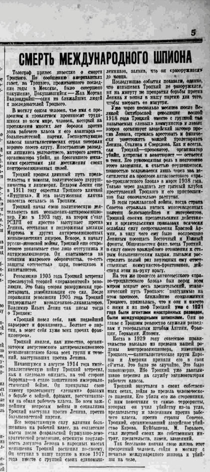 Телеграф принёс известие о смерти Троцкого. По сообщению американских газет, на Троцкого, проживавшего в последние годы в Мексике, было совершено покушение. Покушавшийся — Жак Мортан Вандендрайш (Так в статье. На самом деле убийца Троцкого Рамон Меркадер представился полиции Жаком Морнаром. — «Дилетант») — один из ближайших людей и последователей Троцкого.