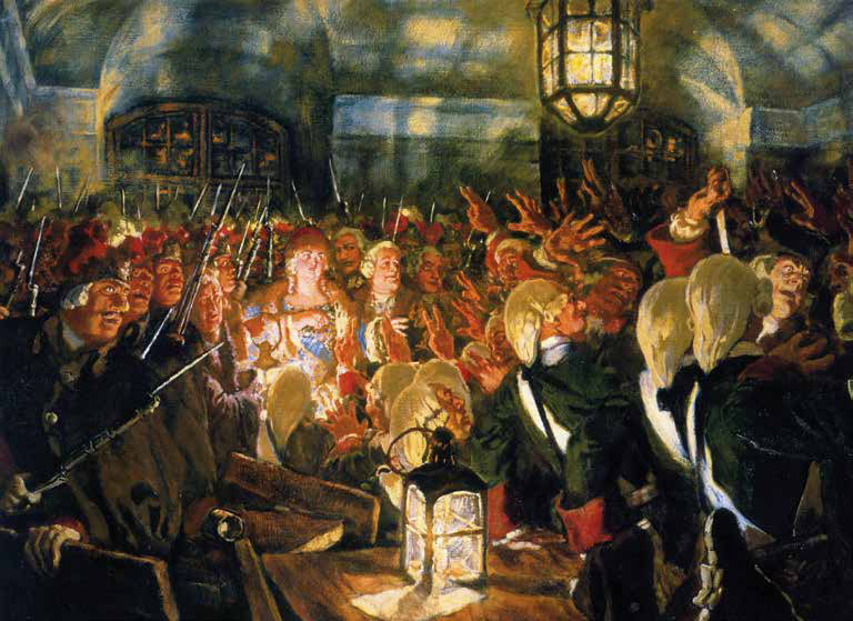 В 1740 году императрица Анна Иоанновна передала престол младенцу Ивану, сыну своей племянницы Анны Леопольдовны, бывшей замужем за герцогом Антоном Ульрихом Брауншвейгским. Регентом при новом императоре назначался многолетний фаворит умирающей императрицы — герцог Курляндский Эрнст Иоганн Бирон. Весьма непопулярный при дворе и в армии, вороватый и трусоватый, Бирон с властью расстался очень быстро: его отстранили именем Анны Леопольдовны гвардейцы во главе с фельдмаршалом Минихом, ставшим ненадолго фактическим правителем при новой регентше. Но и Миних не удержался одесную трона — его подсидел ещё один «придворный немец», Андрей Остерман. Очевидная слабость конструкции и ностальгия гвардии по славным временам Петра Великого подтолкнули Елизавету Петровну, дочь первого императора всероссийского, к перевороту, каковой и был осуществлён, успешно и бескровно, через год и месяц после кончины Анны Иоанновны.