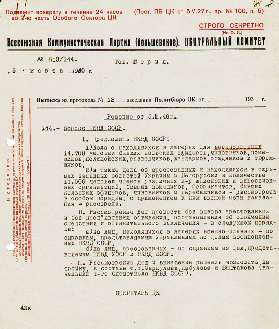 Ну а маститый телеведущий на голубом глазу опровергает «домыслы» сегодняшних западных русофобски настроенных историков, обвиняющих руководство СССР в этом преступлении, а секретные материалы, которые Михаил Горбачёв передал генералу Ярузельскому, тогдашнему президенту Польши, — фальшивкой. Но сам Бурденко, главный хирург Красной армии, перед смертью в 1946 году сознался в том, что его заставили подписать соответствующий протокол. А что касается нюрнбергского трибунала, созданного союзниками по антигитлеровской коалиции, им не с руки было портить отношения со Сталиным, чьи войска стояли во всех странах Восточной Европы. С трудом допускаю, что маститый телеведущий, не разобравшись, поверил в пропагандистский трюк. И вряд ли не знал он о том, что поляков расстреливали не только в Катыни, но и в селе Медном, где никаких немцев не было.