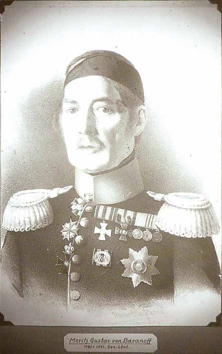 После долгих поисков удалось установить настоящее имя персонажа — генерал-лейтенант Евстафий Евстафьевич Баранов. Несмотря на кажущуюся русской фамилию, он принадлежал к остзейскому роду von Baranoff и являлся лютеранином с именем при крещении Мориц Густав. Благодаря крупнейшему специалисту по балтийской генеалогии Михаилу Юрьевичу Катин-Ярцеву, мне удалось получить сведения о Баранове из «Балтийского архива», собранного за 70 лет Георгом фон Крузенштерном (1899–1989). Этот архив, в том числе девять тысяч фотографий и снимков портретов балтийских дворян, хранится с 1981 года в центре «Фотоархив Марбурга» при Марбургском университете. Нашёлся там и фотоснимок литографии Баранова, выполненной с портрета Тулова.
