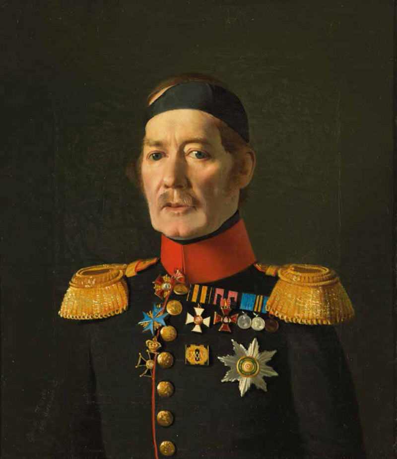 Генерал украшен боевыми наградами. Его юность пришлась на период Наполеоновских войн, о чём свидетельствуют серебряные медали в память Отечественной войны 1812 года и за взятие Парижа 19 марта 1814 года, а также голубой крест на шее прусского ордена Pour le Mérite, который тогда получили полторы тысячи русских офицеров. Ниже прусской награды по борту мундира выпущен чёрный польский крест Virtuti militari 2-й степени. Такие кресты были вручены генералам — участникам Польской кампании 1831 года. То есть уже тогда ветеран имел генеральский чин. Но при этом у него нет медали за штурм Варшавы. Следовательно, генерал не находился в главной армии во время ключевого события той войны.