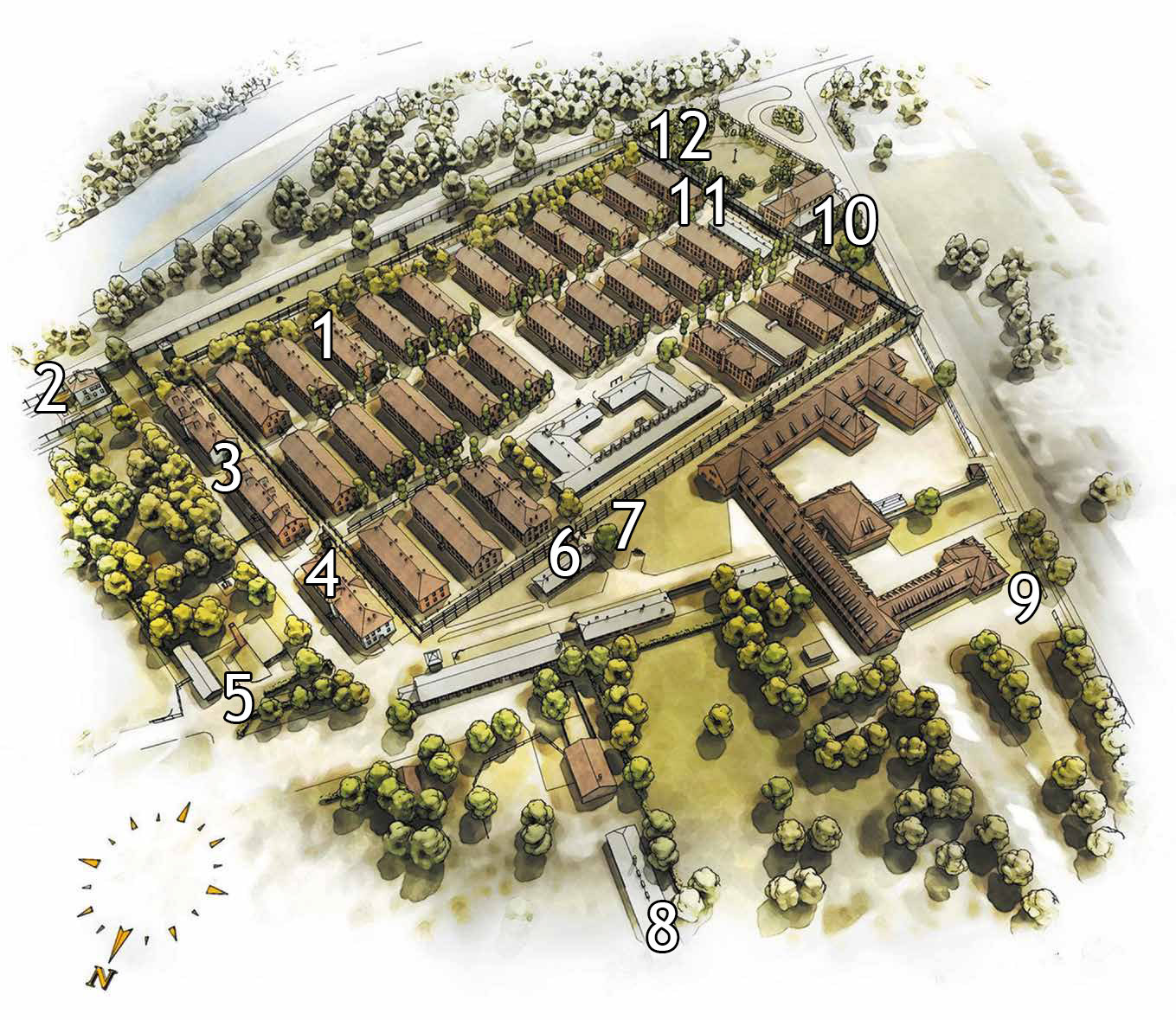 Заключённых размещали в бывших солдатских казармах. Для увеличения вместимости все одноэтажные здания были перестроены в двухэтажные.
